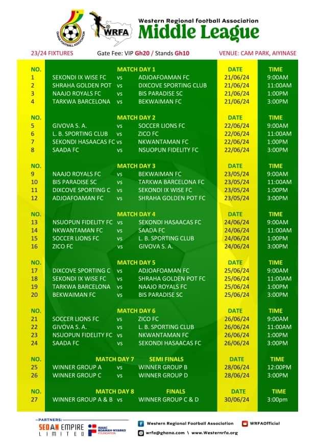 The Western Regional 2023/24 Division Two Middle League will kick start from this week Friday June 21 at the Crosby Awuah Memorial Park in Nzema Aiyinase.
