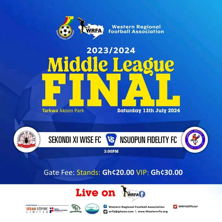 The Western Regional Football Association (WRFA) has announced a new date and venue for the much-anticipated final of the 2023/2024 Middle League. Sekondi Eleven Wise FC will face Nsuopun Fidelity FC in a decisive match to determine the league champion.