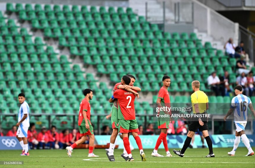 Morocco's defender #02 Achraf Hakimi (C) and teammates celebrate at the end of the match which had started again in an emptied stadium following incidents, a two-hour interruption and the cancellation of Argentina's equalizing goal, in the men's group B football match between Argentina and Morocco during the Paris 2024 Olympic Games at the Geoffroy-Guichard Stadium in Saint-Etienne on July 24, 2024. (Photo by Arnaud FINISTRE / AFP) (Photo by ARNAUD FINISTRE/AFP via Getty Images)
