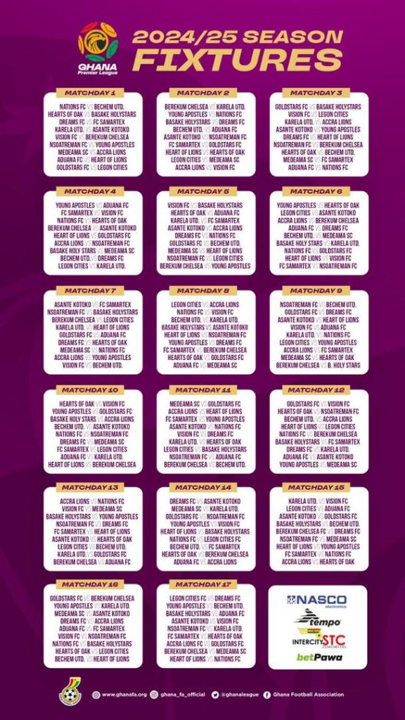 Full fixtures for the 2024-25 Ghana Premier League season.