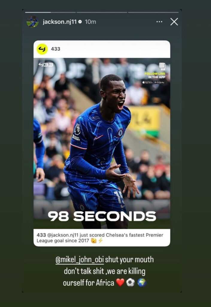 Jackson has sharply criticised former Chelsea midfielder Mikel Obi, telling him to “shut your mouth” and using unprintable language in a heated Instagram post following Chelsea’s 6-2 win over Wolves.