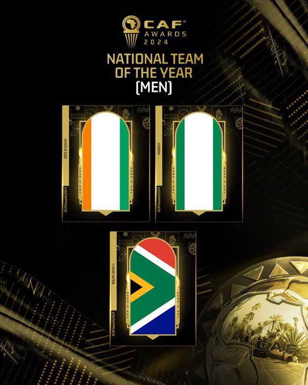 Current reigning African champion, Ivory Coast, 2024 AFCON finalists Nigeria and South Africa will battle for CAF men’s national team of the year award.