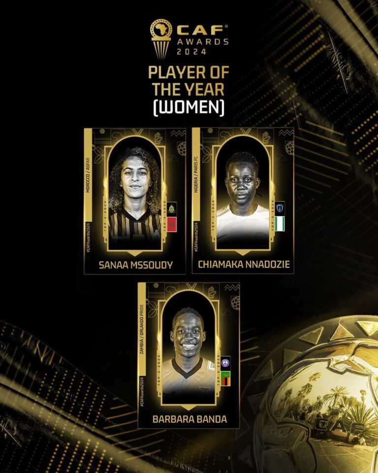 Zambia’s Barbra Banda (Orlando Pride), Sanaa Mssoudy (AS FAR) from Morocco and Chiamaka Nnadozie (Paris FC) from Nigeria are the top three contenders to become the next Queen of Africa football.