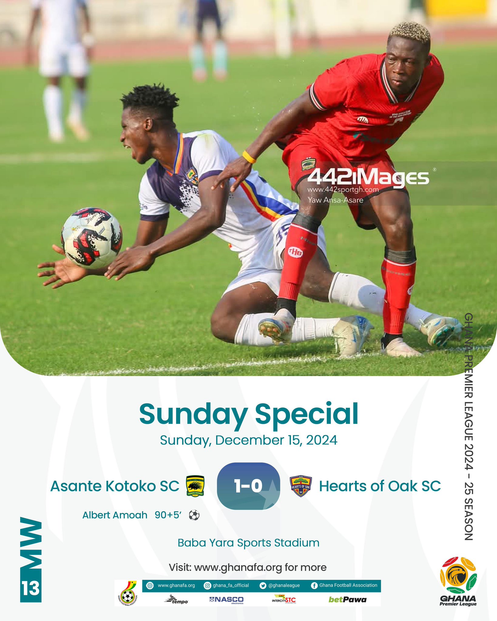 In-form forward Albert Amoah capitalized on a defensive mix up involving goalkeeper Benjamin Asare and Hearts defender Kelvin Osei Asibey to regain possession and slot the ball into the net in the 95th minute.