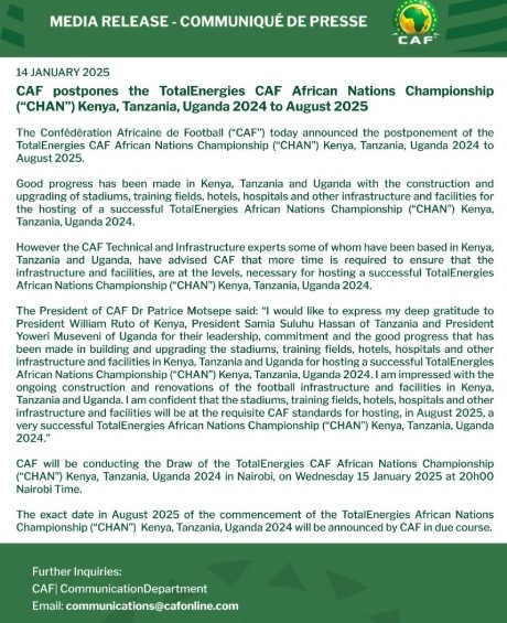 Despite the change in start date, the draw for the competition will go as planned on Wednesday, January 15 in Nairobi Kenya at 17:00 GMT.
