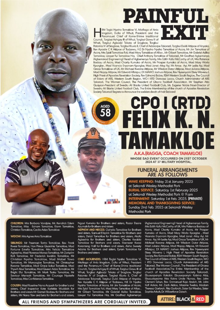 Former coach of Samartex, Karela and Swedru All Blacks Felix Tamakloe will be laid to rest today February 1, 2025 after at the Sekondi Methodist Park.