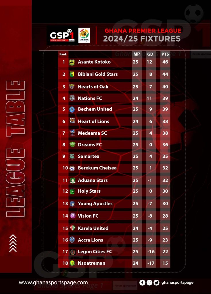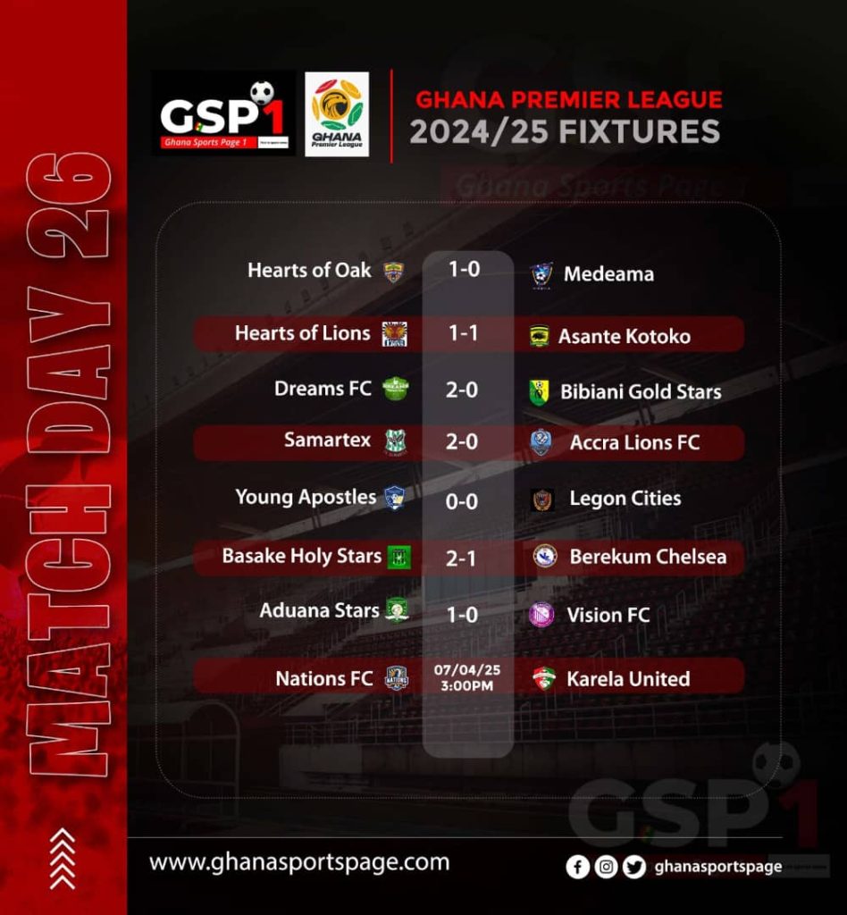 Hearts of Oak bounced back with a hard-fought win over Medeama SC, while Aduana Stars continued their strong form with a 1-0 victory. Defending champions Samartex FC also returned to winning ways, while the relegation battle remains tight with several teams scrambling for survival.