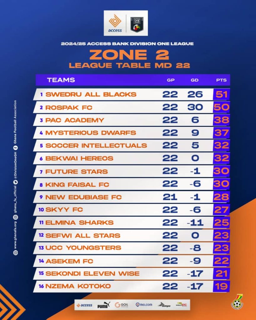 However, Ebusua Dwarfs who were the zone’s favourite to qualify for the premiership are now fourth on the league log with 37 points, Dwarfs’ chances of catching RosPak and All Blacks and returning to their first premier League qualification since 2023 have dropped from 30% to just 9% .