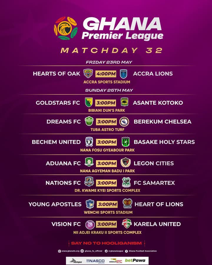 Elsewhere, Bechem United will welcome Basake Holy Stars to the Nana Fosu Gyeabour Park, Dreams FC will hope to defeat Berekum Chelsea at the Tuba Astro Turf, while Young Apostles will welcome Kpando Heart of Lions to the Wenchi Sports Stadium in a must-win for Heart of Lions.