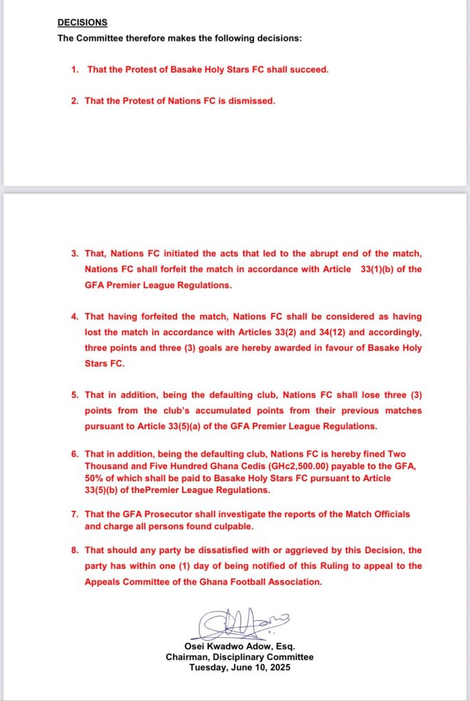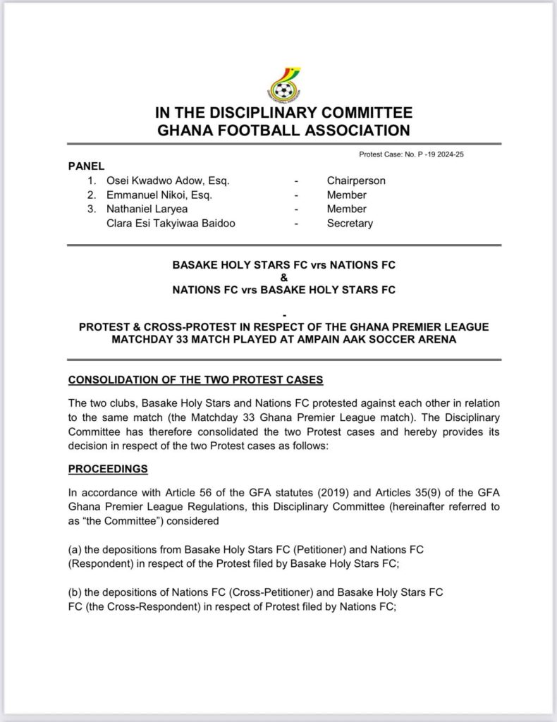 Basake Holy Stars have been declared winners of a cross-protest against Nations FC for boycotting their game in the match week 33 of the Ghana Premier League.