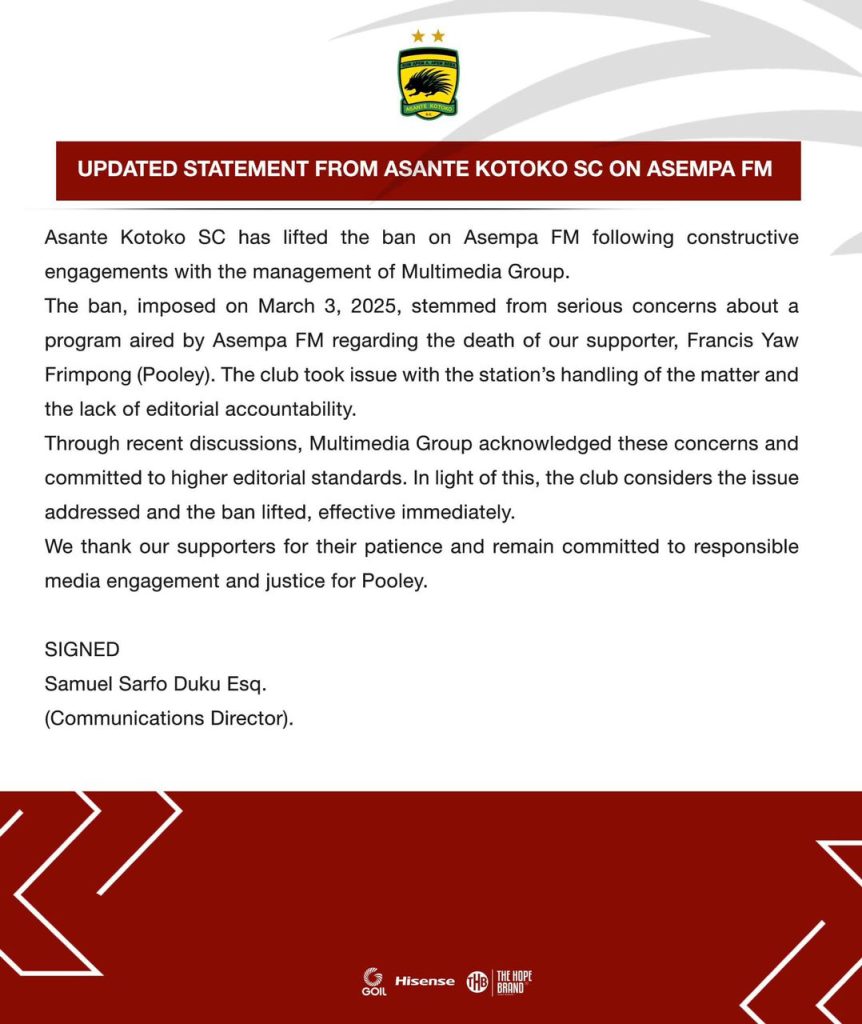 “Asante Kotoko SC has lifted the ban on Asempa FM following constructive engagements with the management of Multimedia Group.