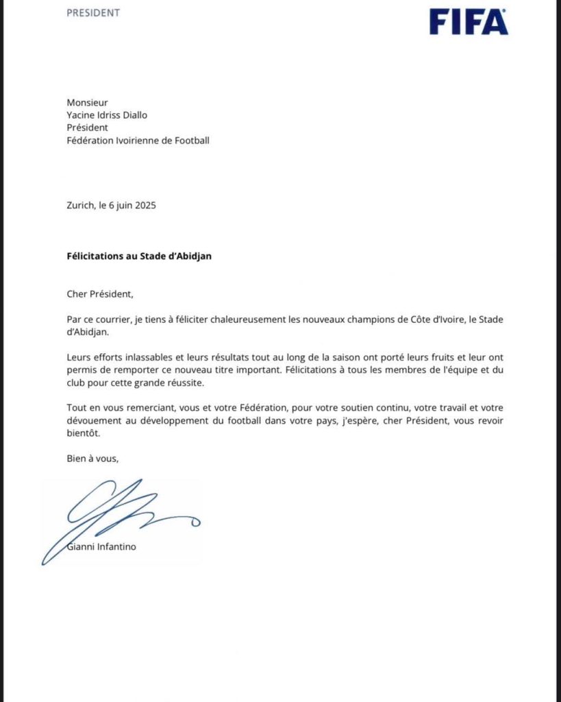 Meanwhile, the Federation of the International Football Association (FIFA) through their President Gianni Infantino have congratulated Stade d’Abidjan for their league success.