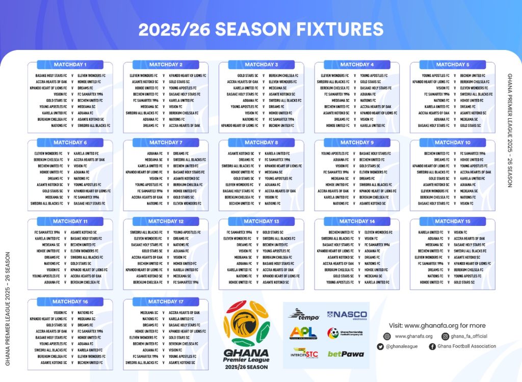 The Ghana Football Association has officially unveiled the full fixture list for the 2025/26 Ghana Premier League season, providing fans and clubs with an exciting first look at the matchups that will shape the upcoming campaign.