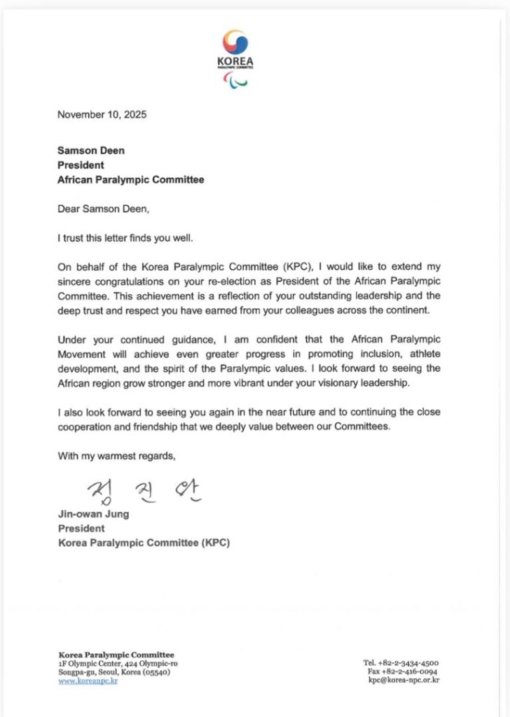 KPC President Jin-owan Jung described Deen’s victory as a reflection of “outstanding leadership and deep continental trust,” while the BDH Paras Foundation’s Chairman Bae Dong Hyun reaffirmed his organisation’s “unwavering commitment” to supporting Africa’s Paralympic progress.